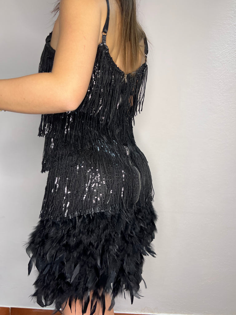 Abito con paillettes , frange paillettatate e piume nella parte finale dell'abito. Chiusura con zip nel retro del vestito. Taglia Unica (veste dalla S alla M).