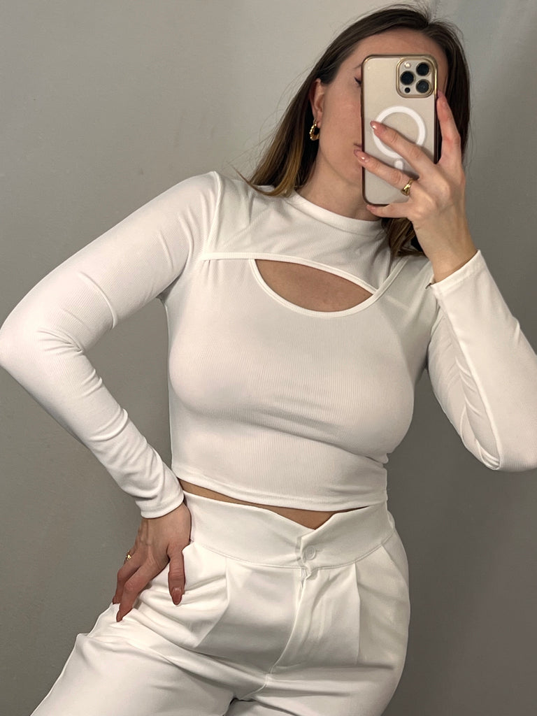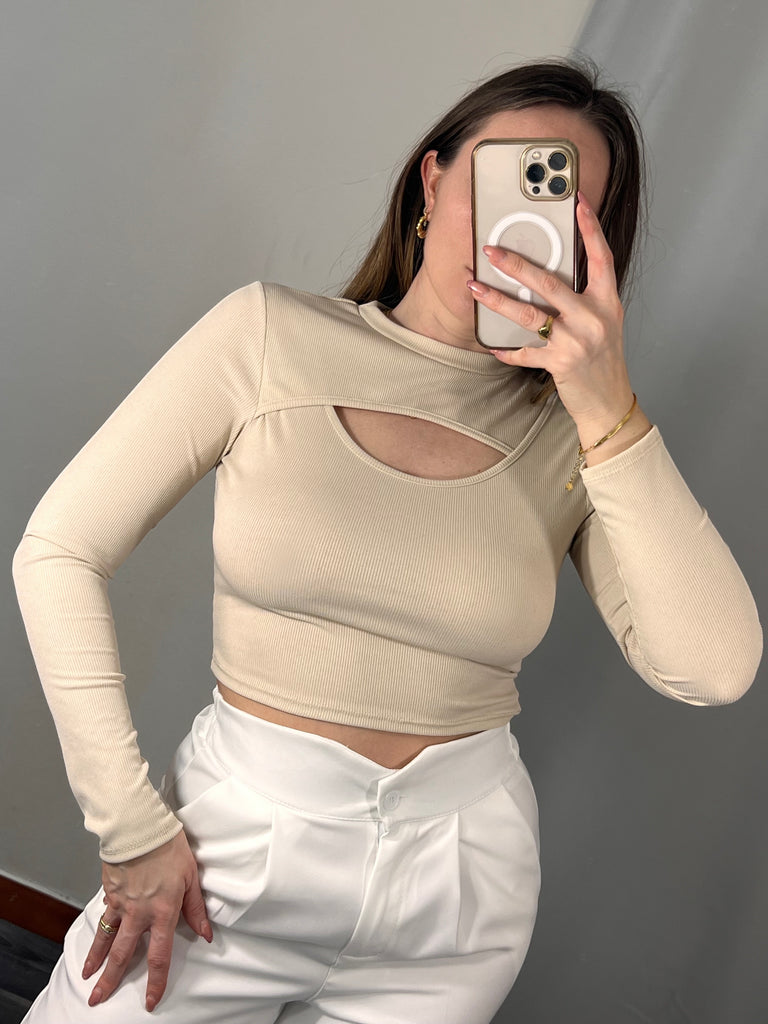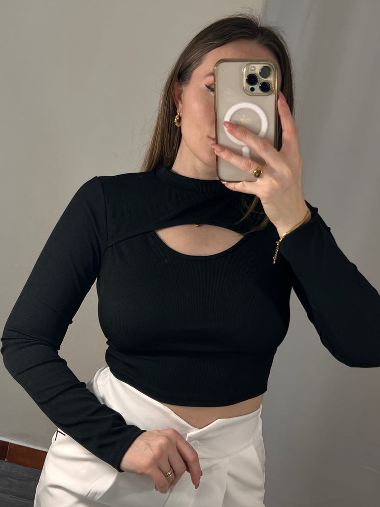 Top Crop a coste elasticizzato, con apertura sopra il seno. Taglia Unica (veste dalla S alla L)