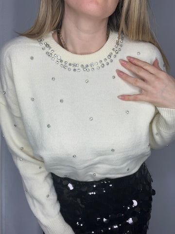 Maglione bianco con strass sul girocollo e sparsi nella parte davanti del maglione.