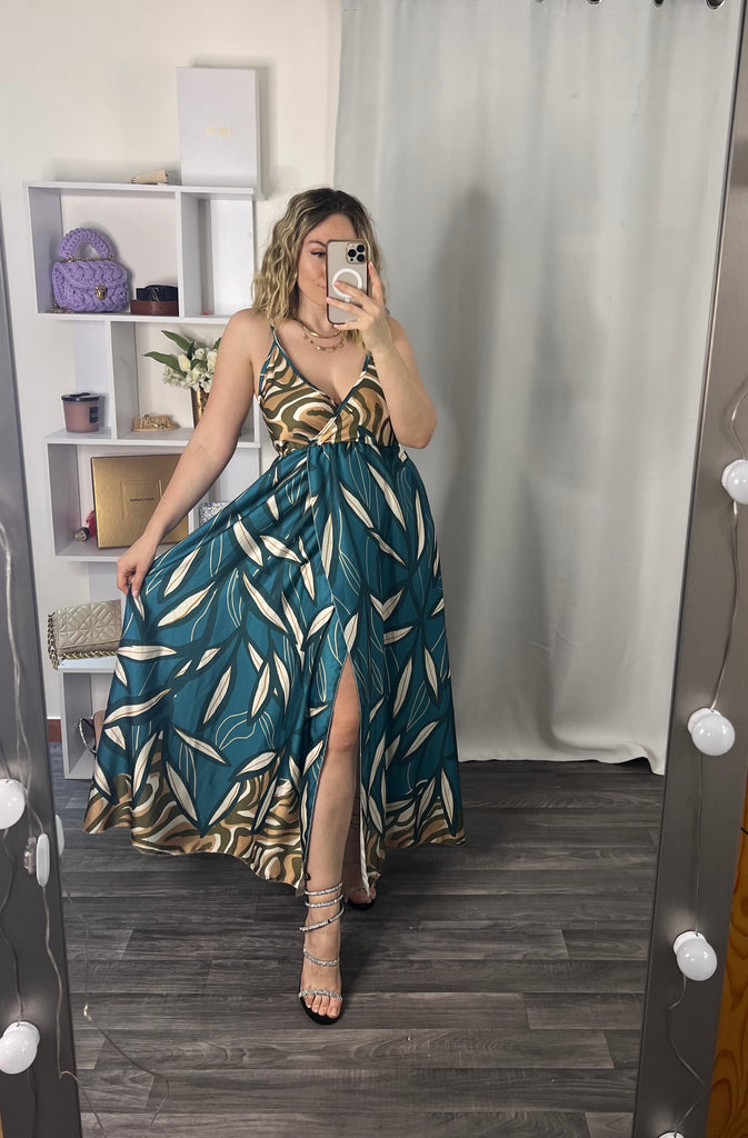 Vestito in Satin a fantasia zebrata, chiusura gonna a portafoglio. Taglia Unica (veste dalla S alla L).