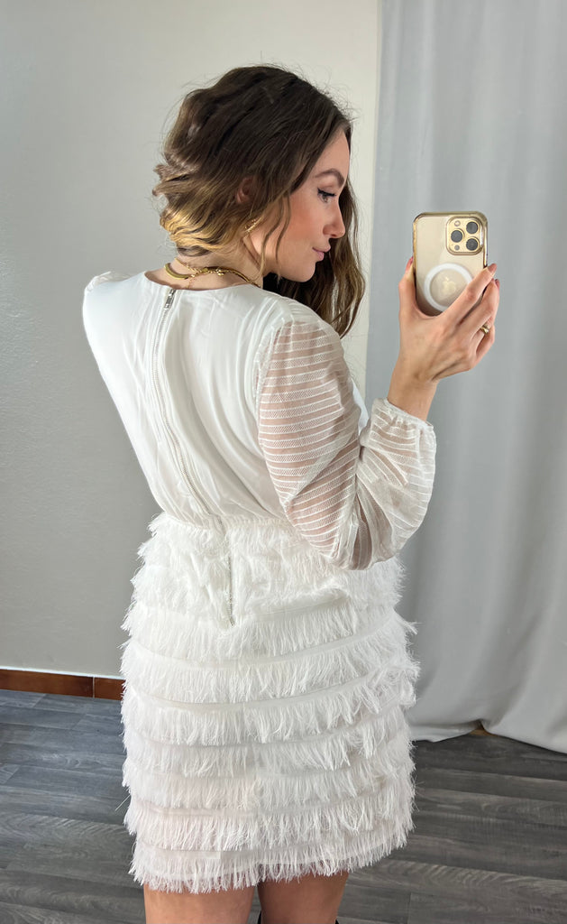 Vestito corto a frange nella parte della gonna e trasparenze sulle maniche.
